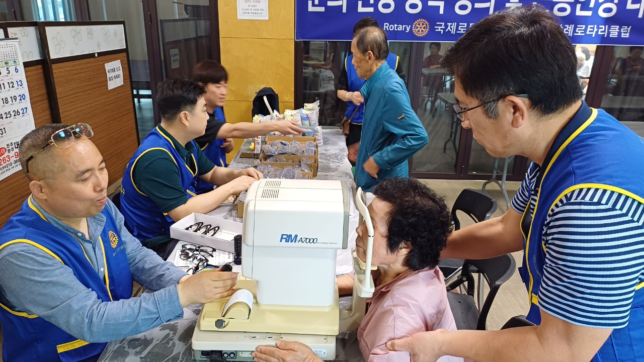 국제로타리3670지구 삼례로타리클럽(회장 김태형)은7월23일(화) 사단법인 대한노인회 완주군 지회(지회장 김영기)삼례읍소재 센스안경원(원장 오상영)과 공동 주관으로 완주군 노인대학 수강생을 대상으로 "눈의건강 상식과 노안"이라는주제로 강의와 수강생150명을선정하여 눈 건강을 위한 시력측정과 맞춤형 근용안경(돋보기)을 무료로 제공하는 "어르신 밝은 세상 안경 지원 사업"을 진행했다.