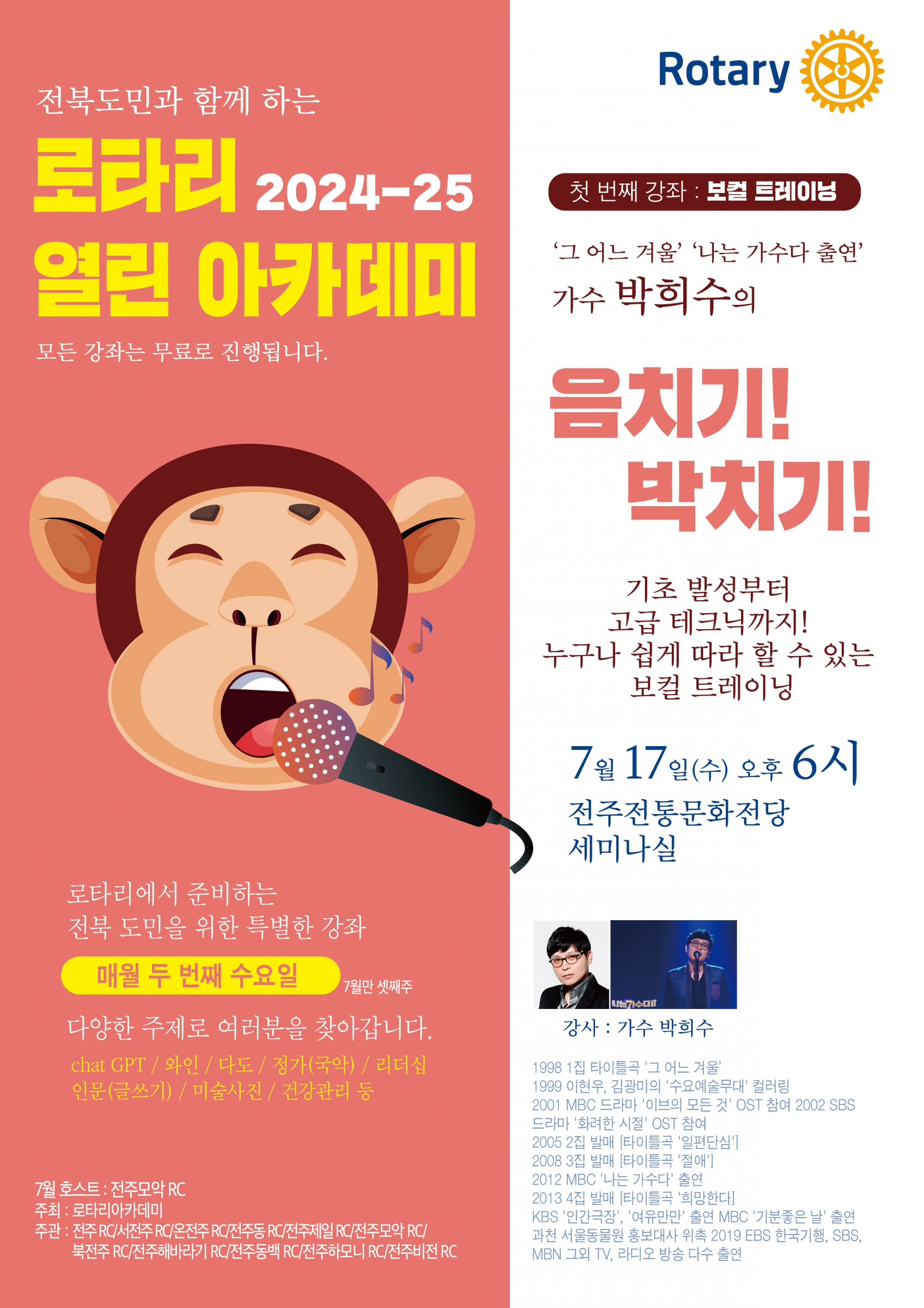 [동호회]2024-25 로타리 열린 아카데미, 첫 강좌 보컬 트레이닝 개최 안내
