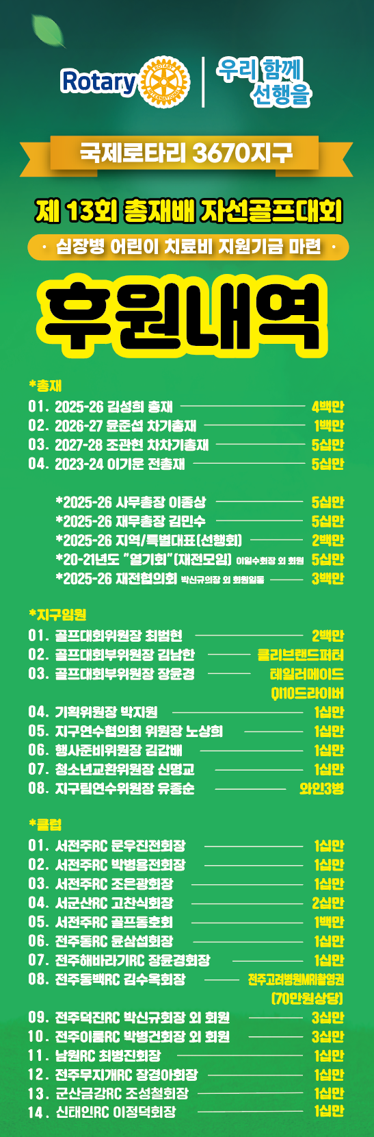 국제로타리 3670지구 제13회 총재배 자선골프대회 결과 및 후원내역 안내